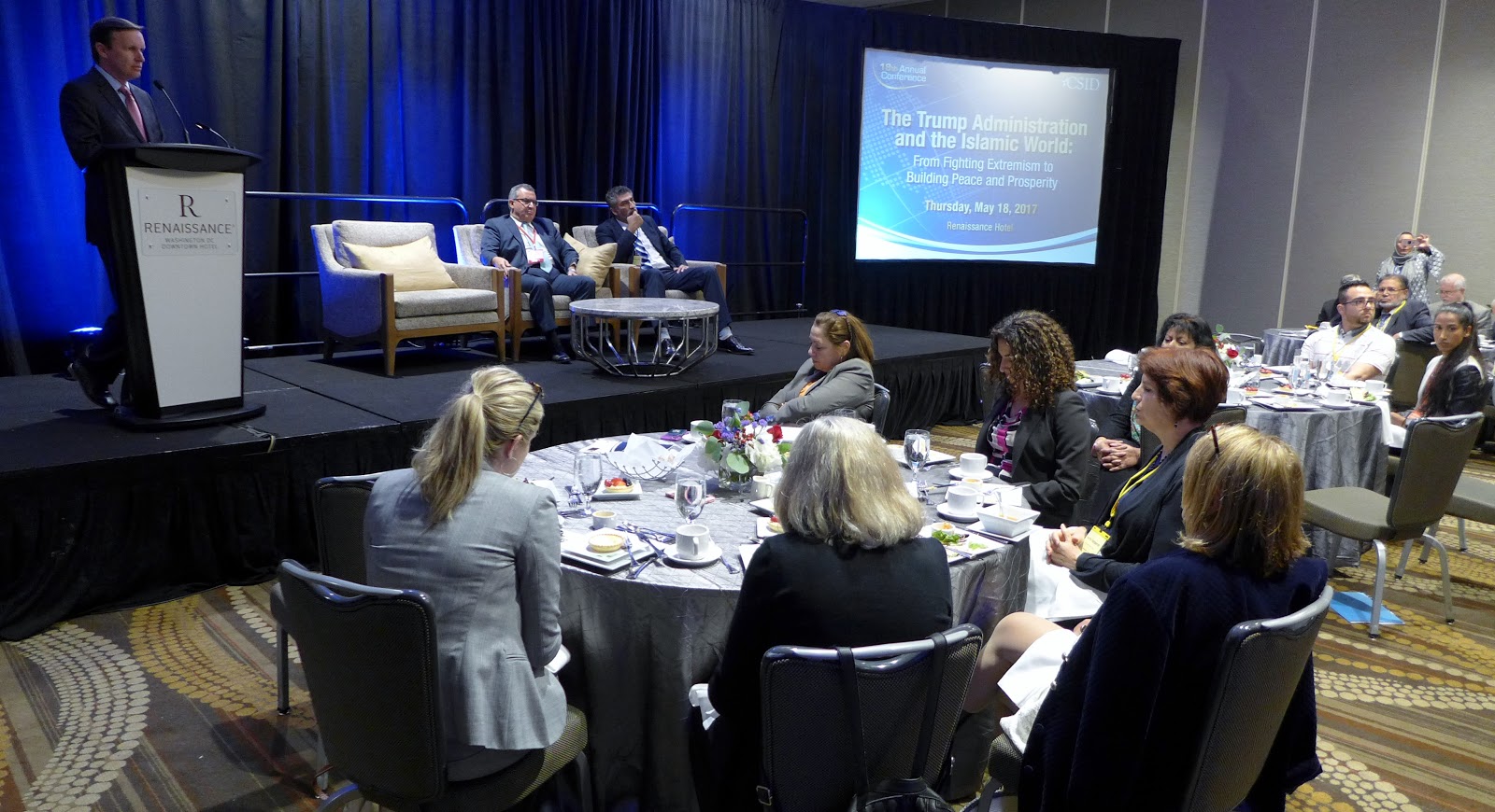 Senator Chris Murphy (CT), member of the Foreign Relations and Appropriations committees of the Senate, began his address during the luncheon portion of the conference by offering a different sort of engagement strategy for the United States in the world. Senator Murphy reiterated his criticism of the Trump administration’s implicit and sometimes explicit positioning of Islam and Muslims as threats to the United States, illustrated most especially through Trump’s executive order which sought to halt immigration of Muslims from seven Muslim-majority countries.